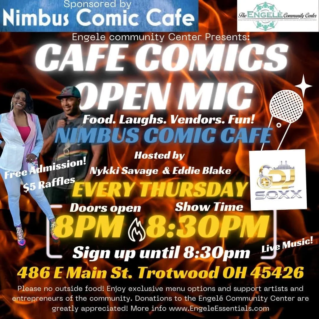 Back to All Events Cafe Comics Open Mic - Side Bar Edition Thursday, January 16, 2025 8:30 PM 11:00 PM Nimbus Comic Cafe 486 East Main Street Trotwood, OH, 45426 United States (map) Google Calendar ICS Step up your crowd work game and get real time feedback on jokes during your set! No heckling allowed - come add to the joke and just have fun with your hosts Nykki Savage and Eddie Blake while DJ Soxx keeps the vibe going!Admission: Free